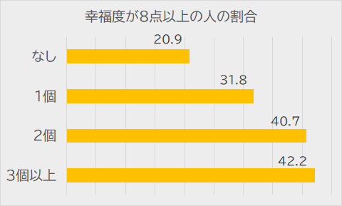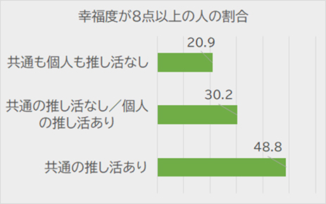 幸福度を10点満点で自己評価してもらうと、推しがない人よりも推しがある人の方が、幸福だと感じている比率が高く、複数の推しがあればさらに割合が増していました。家族で共通の推しがある場合も幸福度が高まる傾向があります。確かに、アイドルグループのコンサートに母娘が連れ立って行くことも多く、楽しそうです。親子2世代、3世代で共通の話題があれば、食卓での会話も弾むようになるでしょう。