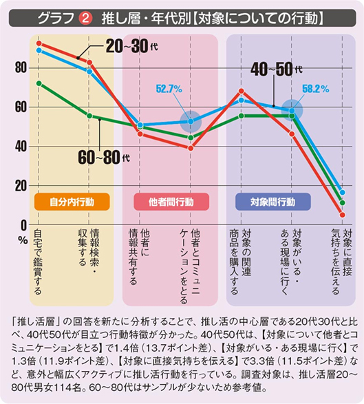 「推し層」の世代別データ(グラフ)で意外だったのが、40代、50代のデータ。20代、30代より幅広くアクティブに行動しているうえ、得られるメリットも40代、50代のほうが高い結果に。より推し活ライフを享受している世代ということが示されました。