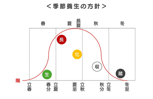 今から2000年前に成立した東洋医学の古典「黄帝内経」では、春夏秋冬にかなった生活スタイルで過ごすことで、自然の働きをより享受でき、心身がよい状態になり、生命力を養うことができると説かれています。この書物の中では、四季を、春は「生」、夏は「長」、秋は「収」、冬は「蔵」という言葉で表しています。
