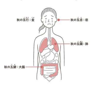 東洋医学で、秋に関係が深い五臓(肝・心・脾・肺・腎」の5つの臓腑)の「肺(呼吸)」が乱れると、汗が出ない・出過ぎる発汗異常や、鼻水・鼻づまり・咳などの風邪症状、かゆみ・シミ・シワなどの皮膚や肌トラブルが起こりやすくなります。さらに、肺は「悲しみ」を司る五臓なので、肺が弱ると、悲しみや気分の落ち込みなどが出やすくなります。