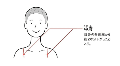 肩の前面、鎖骨の外側端から指2本分下がったところには「中府」という「肺経」の経絡(けいらく:ツボとツボを結ぶ道のこと)に属するツボがありますが、両手を体の後ろで組んで、3回ほど深呼吸をします。肩前面が伸びているのを感じるはずです。